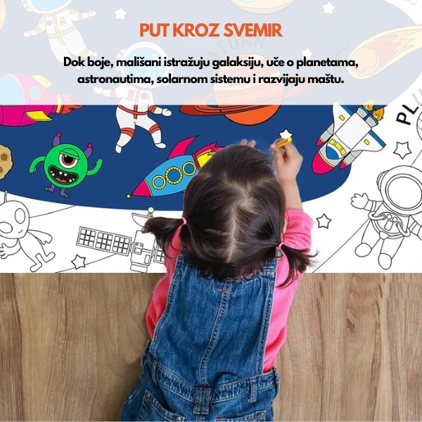 Dečija bojanka u rolni puna je zanimljivih motiva kao što su astronauti, rakete, planete, svemirski brodovi i galaksije. Dok boje, mališani istražuju galaksiju, uče o planetama i solarnom sistemu i razvijaju maštu dok zamišljaju svoje svemirske avanture.