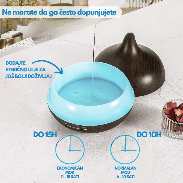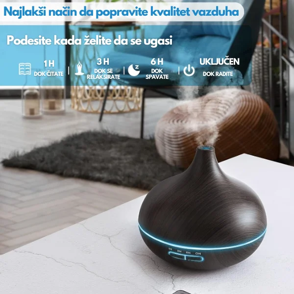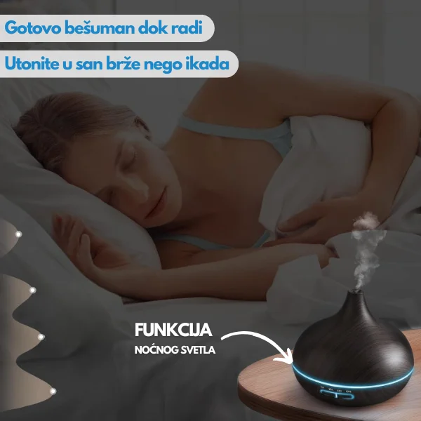 Aroma difuzer za eterična ulja će pružiti sve uslove koji su neophodni kako bi se kvalitetno odmorili i napunili baterije. Mirisna eterična ulja pomažu telu da se opusti, a nežno, noćno svetlo stvara umirujuću atmosferu koja olakšava da brzo utonete u san.